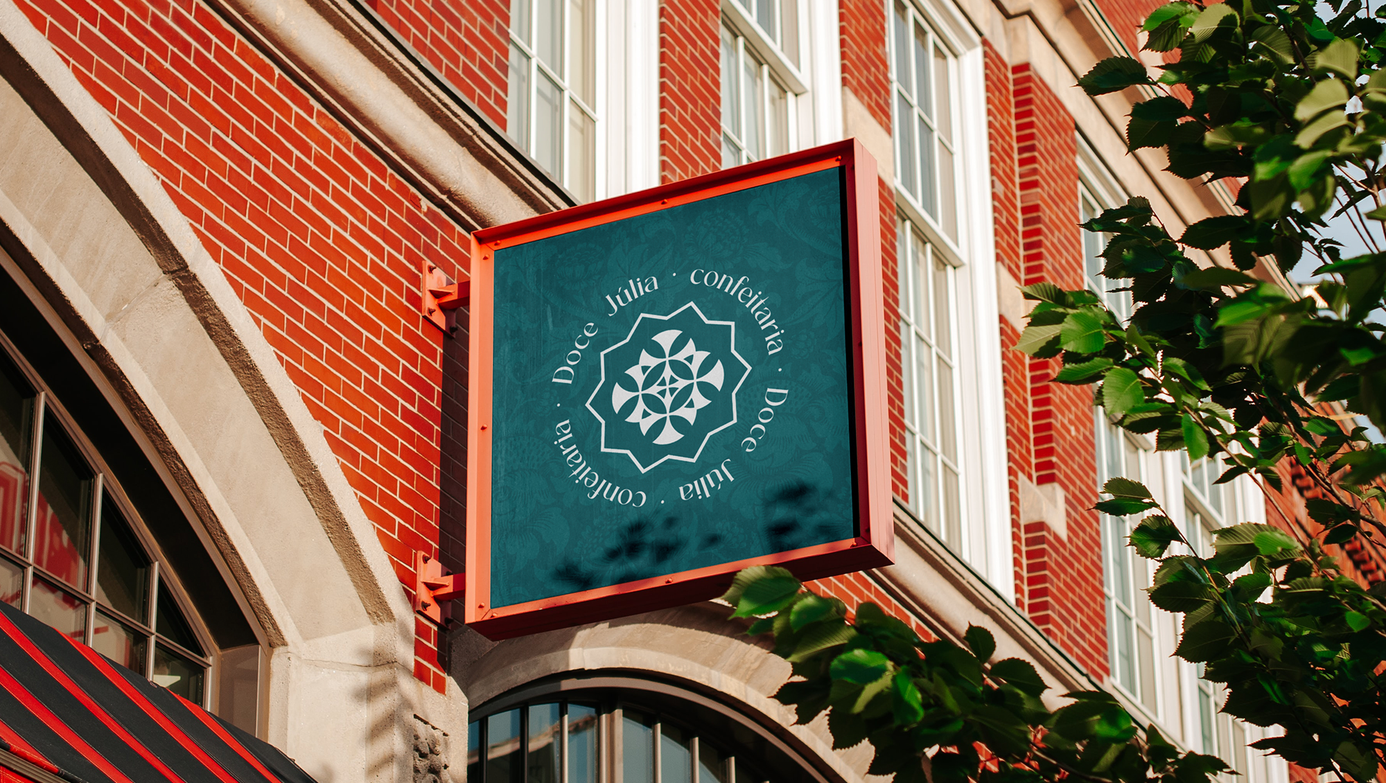 O logotipo da Doce Júlia representa o ingrediente central da confeitaria: o açúcar. Criei um ícone que remete a um cristal, inspirado na estética dos vitrais da era vitoriana.